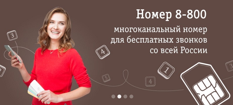 Номер 8-800 — это единый бесплатный номер для ваших клиентов со всей России. Клиенты обращаются чаще и не стремятся поскорее завершить разговор, если звонок для них бесплатный. Создайте имидж солидной компании, разместив запоминающийся номер в коде 800 на вашем сайте и в рекламе.